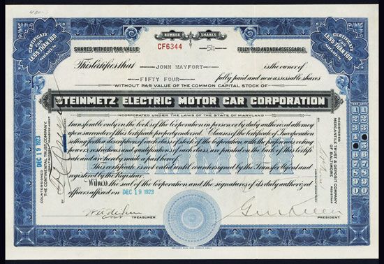 Maryland, 1923, 54 Shares, Issued and Uncancelled Stock, Black on blue border and underprint, VF condition, SBNC.