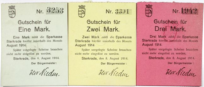 Germany. 1914. Sterkrade Saving Bank, K0380-b, Lot includes a trio of uniface 1, 2, and 4 Mark Notgeld, with Coat of Arms validation handstamp and signatures. About to Choice Unc. (3)