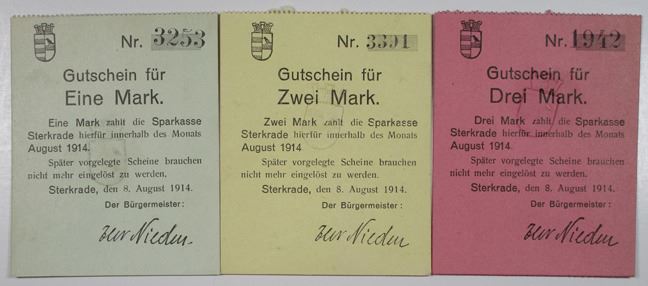 Germany. 1914. Sterkrade Saving Bank, K0380-b, Lot of 3 notes, Includes: uniface 1, 2, and 4 Mark Notgeld, with Coat of Arms validation handstamp and signatures. About to Choice Unc. (3)