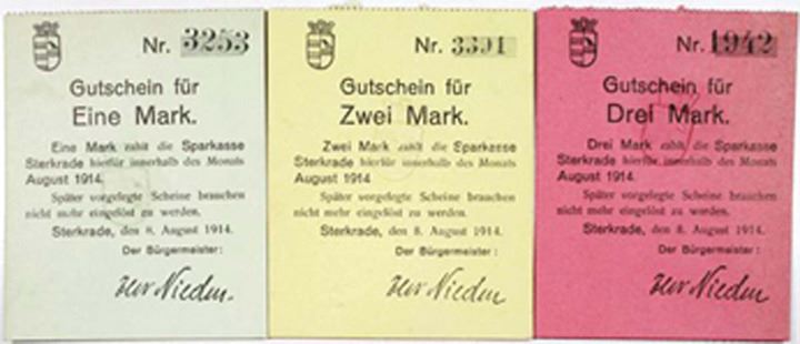 Sterkrade. Sparkasse Sterkrade, 1914. Lot of 3 Issued Notgeld Emergency Scrip Notes.