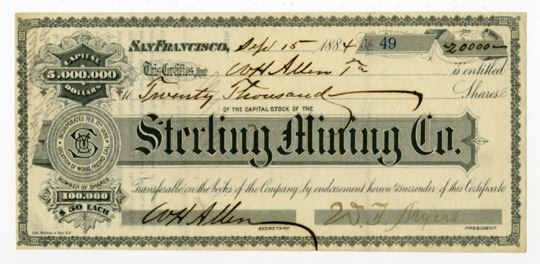 Fresno, California, 1884. 20,000 Shares I/U Capital Stock Certificate, Black text with gray border and undertint, Company logo at left, S/N 49, VF condition. Location of works was in Fresno, California. Lith., Britton & Rey, S.F.