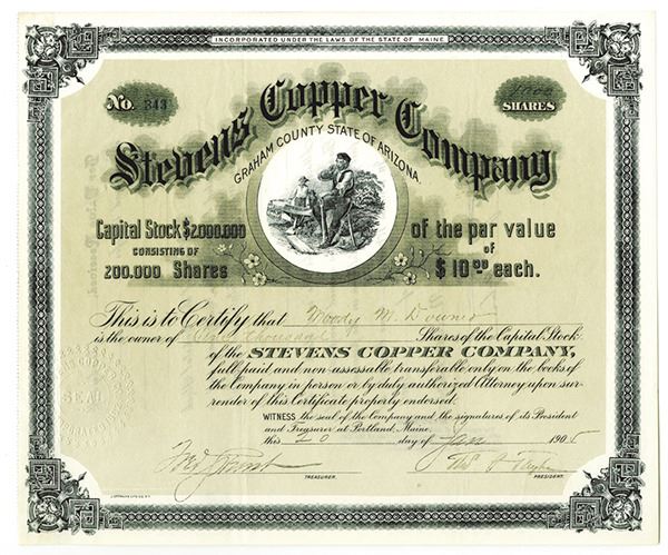 Arizona Territory, (Inc. in Maine), 1905. 1000 Shares I/U Capital Stock Certificate, Black text with black border, tan background, Man at rest from work at top center. XF condition. Mines located in Graham County, Arizona.