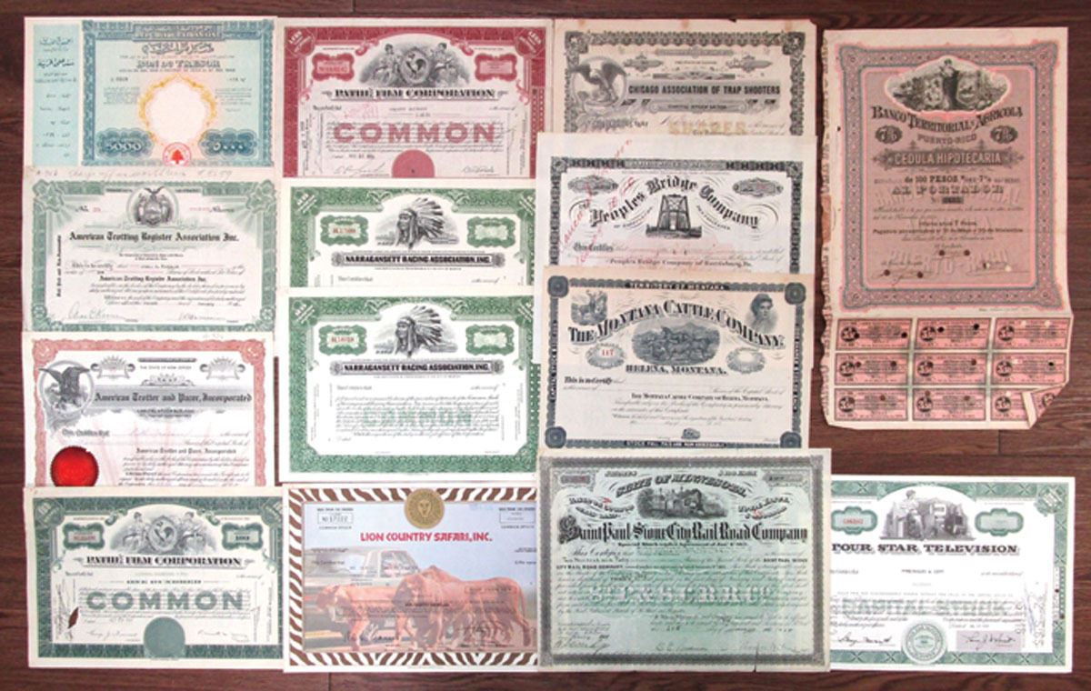 Lot of 14 I/U and I/C Assortment of Stocks and Bonds, Highlights include: Lion Country Safari, 1980; Peoples Bridge Co., 1890; Saint Paul and Sioux City Rail Road Co., 1904; Four Star Television, 1963; Banco Territorial Agricola de Puerto-Rico, 1895 and more. Items range from Fine to XF condition. (14). Sold "AS IS" no returns accepted.
