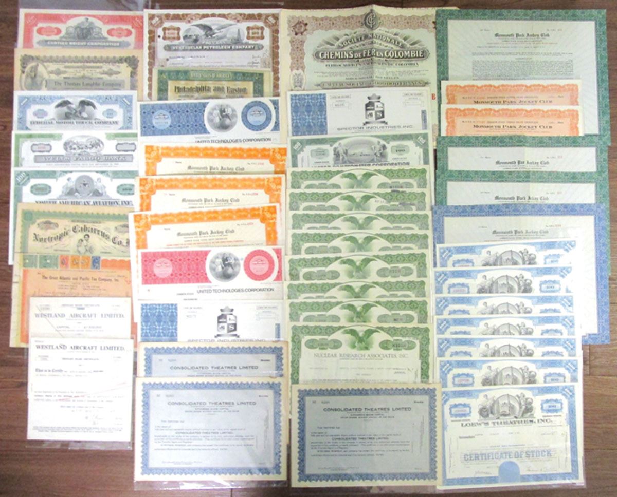 Lot of 40+ Issued Stocks and Bonds, Highlights Include: Curtiss-Wright Corp., Wells Fargo Bank, North American Aviation, Inc., Great Atlantic and Pacific Teas Co. Inc., Westland Aircraft Ltd., Venezuelan Petroleum Co., Philadelphia and Easton Railway Co., Monmouth Park Jockey Club and many more. Certificates range from VF to XF condition. (44). Sold "AS IS" no returns accepted.