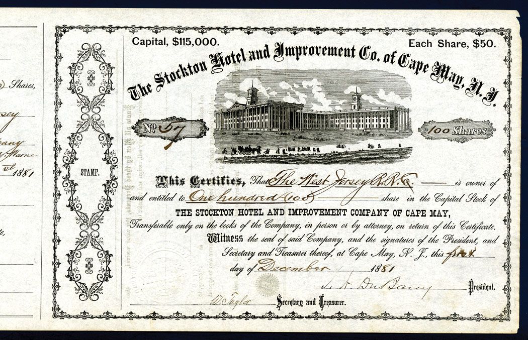 NJ, 1881, 100 Shares, I/U, Large vignette of hotel by beach, S/N 57, Issued to the West Jersey R.R.Co. VF condition with counterfoil on left. Attractive.