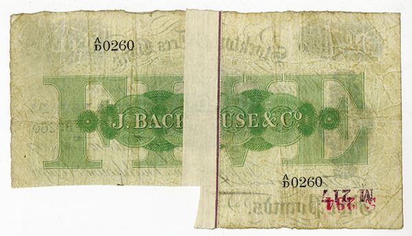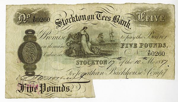 Stockton, England, £5, Issued, Harbor scene in middle, S/N A/D 0260, Choice Fine to VF with signature cut out on bottom right to cancel note.