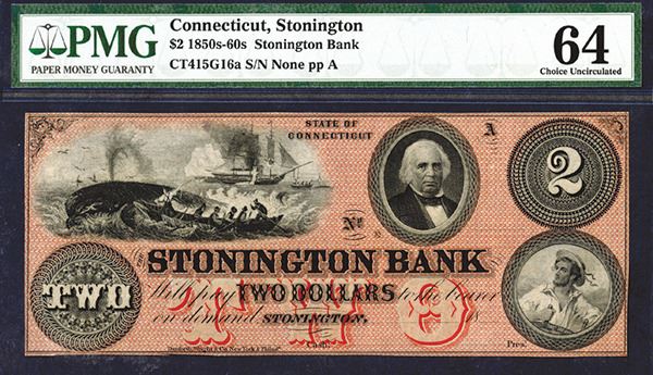 Connecticut. 2 Dollars. Nice whaling scene at top left, bold red underprint. Remainder. Unnumbered, unsigned. Graded PMG Choice Uncirculated 64.