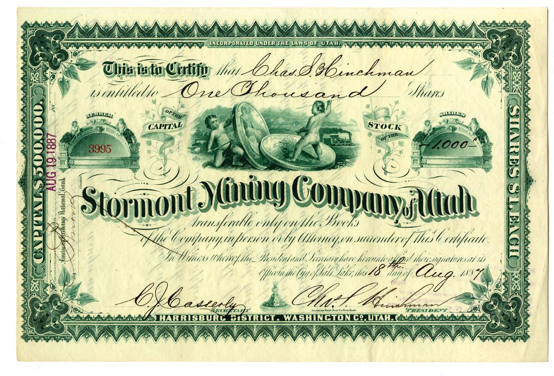 Utah, 1887, 100 Shares, I/U Stock certificate, Black on green border and underprint, Vignette of cherubs with U.S. coins holding sword and arrow, XF condition, ABNC.