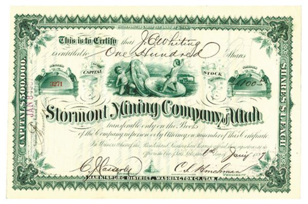 Utah. 100 Shares Capital Stock Issued Certificate, Green print on green border, Cherubs fighting on large coins at top, VF-XF condition, ABNC.