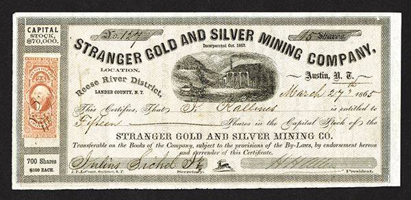 Nevada Territory (Issued right after statehood). 15 Shrs Stock Certificate. Issued. Uncancelled. Revenue stamp at left end. VF+