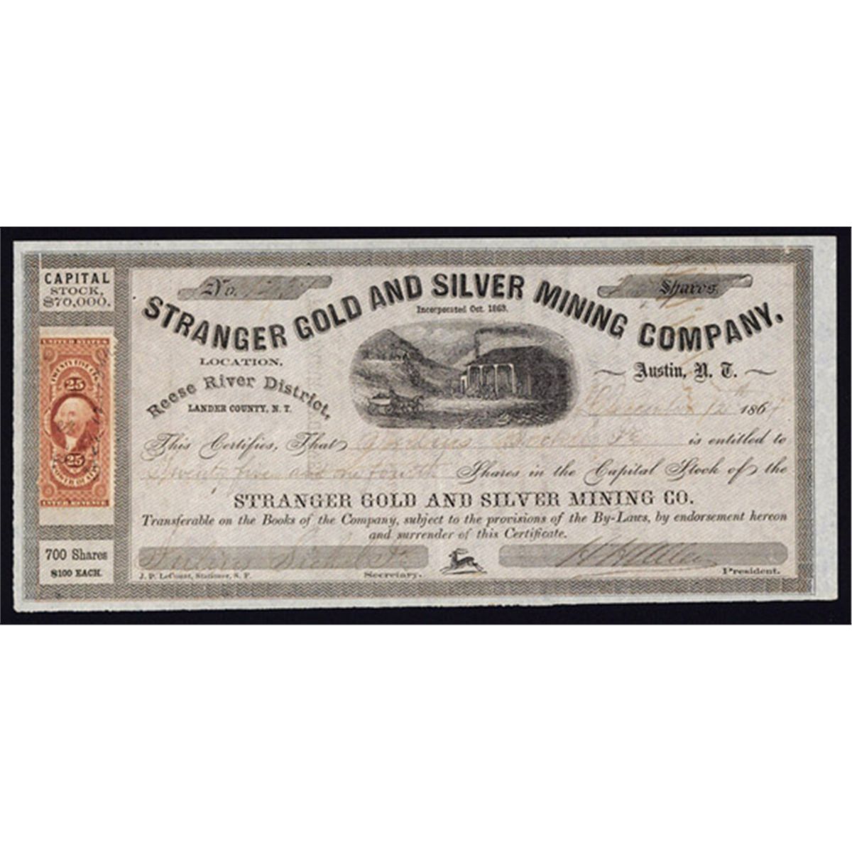 Nevada Territory, December 12, 1864, Horizontal 25 1/4 Shs, Issued and uncancelled stock certificate, black border on light peach underprint, ore wagon going to smelter or mine, revenue stamp attached, XF condition.