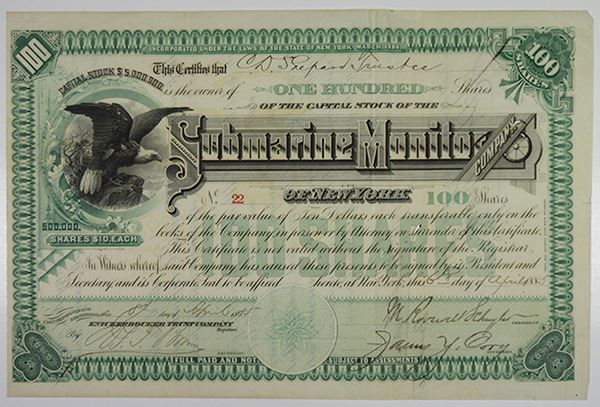 New York. 100 Shrs, I/U Stock Certificate. Black on green border and underprint, eagle at left with title at right, S/N 22, Choice Very Fine. The company designed and manufactured a submarine boat designed for use in placing torpedoes under the bottoms of war vessels. It is the design of her owners, The Submarine Monitor Company, to construct a larger vessel, to be provided with many additional improvements. Yet the little Peacemaker has obtained such success that, if the new craft does any better, it will be a subject of congratulation for those interested. The Peacemaker is thirty feet long, seven and a half feet wide, and six feet deep. Signed by M. Rosewell Schuyler as president. ABNC.