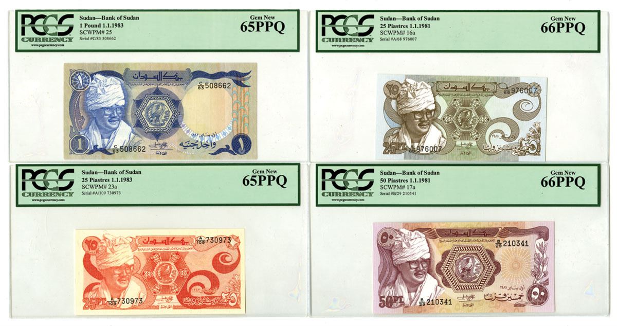 Sudan, 1981-83. Lot of 4 Issued Banknotes, Includes: 1981, 25 Piastres, P-16a, PCGS graded Gem New 66 PPQ; 1981, 50 Piastres, P-17a, PCGS graded Gem New 66 PPQ; 1983, 25 Piastres, P-23a, PCGS graded Gem New 65 PPQ; 1983, 1 Pound, P-25, PCGS graded Gem New 65 PPQ. Notes are in different colors with portrait of President J. Nimeiri in headdress at left on obverse and National Landmarks on reverse. (4). Sold "AS IS" no returns accepted.