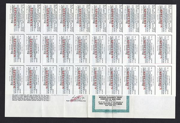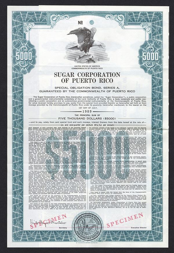 P.R., Specimen $5000 Bond, Black on green border, screaming eagle on top, Coupons attached, VF. Northern BNC.