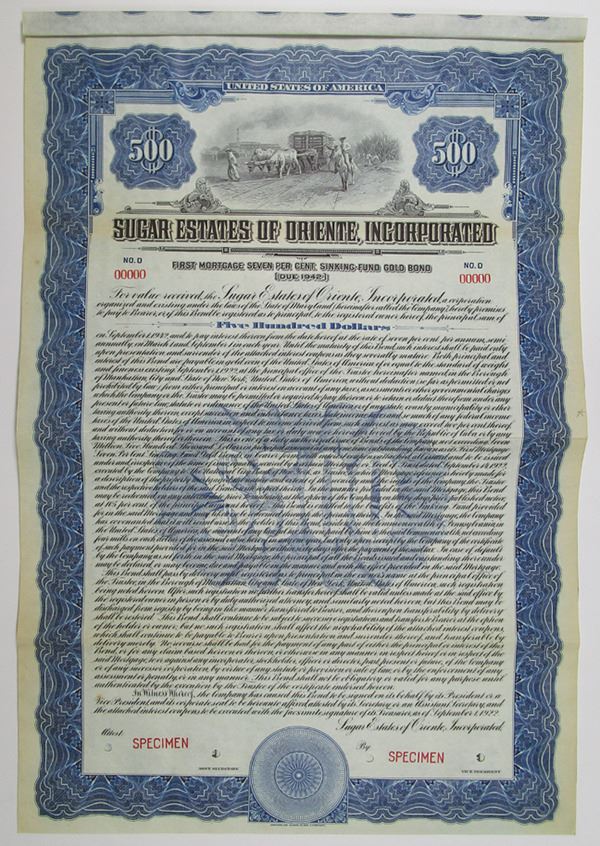 Cuba (Inc. in Maryland), 1922. $500 Specimen 7% First Mortgage Sinking Fund Gold Coupon Bond, Black text with blue border and undertint, Cattle pulling sugar cane near man on horse at top center. Red specimen overprints, 00000 serial numbers, and POCs. VF condition, ABNC.