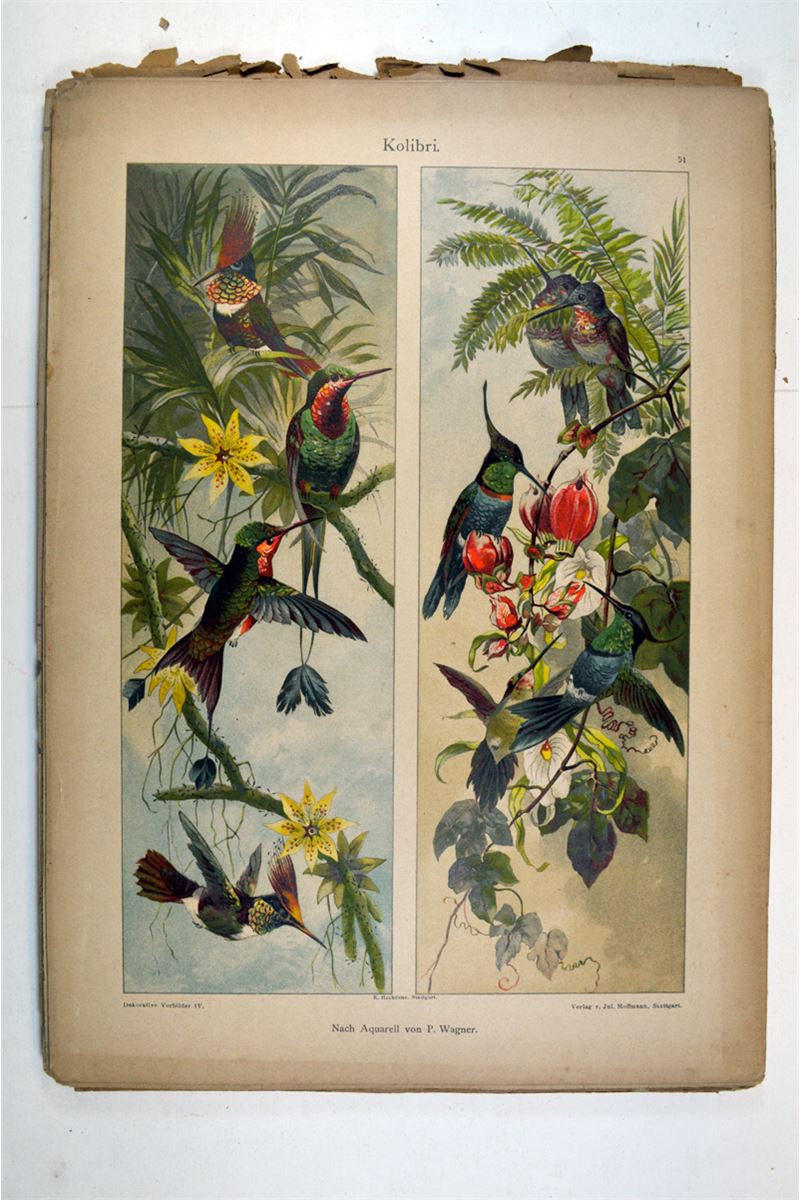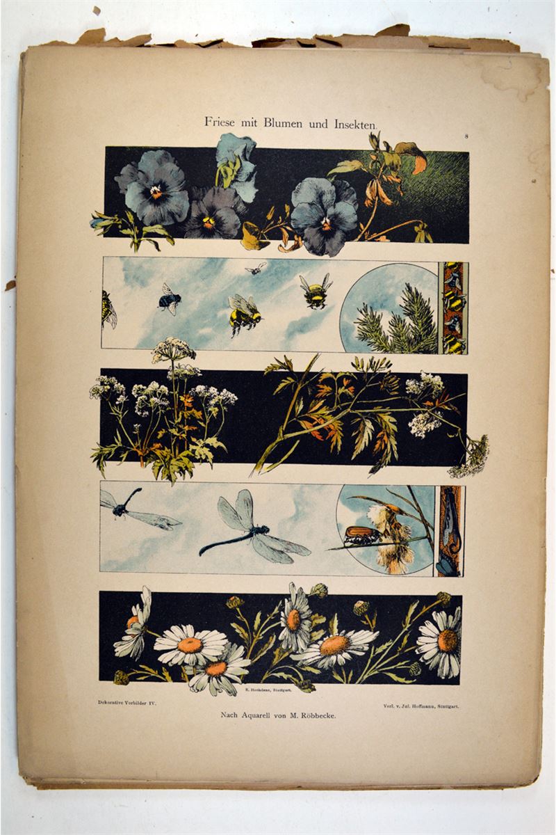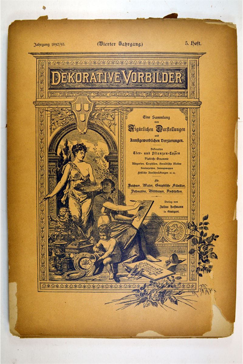 Suggestions in Design. A comprehensive series of original sketches in various styles of Ornament, arranged for application in the decorative and constructive arts. Parts XII, XIII, XIV, XV, XVI, XVII, XVIII, XIX, XX. "Book" pages are nice, but some are water stained in a lower corner. Chapter covers are of a lesser paper, now chipping at the edges. Not sure if all pages to each section are with that section, or included. 96 leaves, some printed with text on both sides, some are one-sided plates. Dekorative Vorbilder ca.1892-93, Series Book. Julius Hoffmann, Stuttgart. 64 plates. Some edge tears affecting illustration area otherwise "Book" pages are nice. Chapter covers are of lesser paper quality, now chipping. 2 book series.