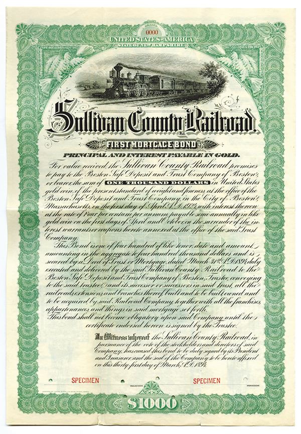 New Hampshire. $1000. 1st Mortgage 4% Gold Coupon Bond. Green ornate border and undertint. Train R-L over title. VF condition. Red specimen overprint and POC's. ABNC. Unlisted railroad in Cox. Rare New Hampshire railroad bond..