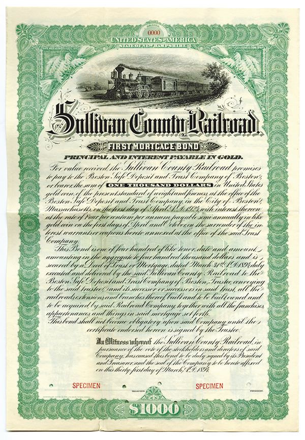 New Hampshire. $1000. 1st Mortgage 4% Gold Coupon Bond. Green ornate border and undertint. Train R-L over title. VF condition. Red specimen overprint and POC's. ABNC. Unlisted railroad in Cox. Rare New Hampshire railroad bond..