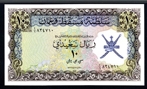 Oman, ND (1970), 10 Rials Saida, P-6a, Issued banknote, S/N A/1 834710, Wmk: Arms, PMG graded Gem Uncirculated 66 EPQ, Amazing note with large even margins and bright colors.