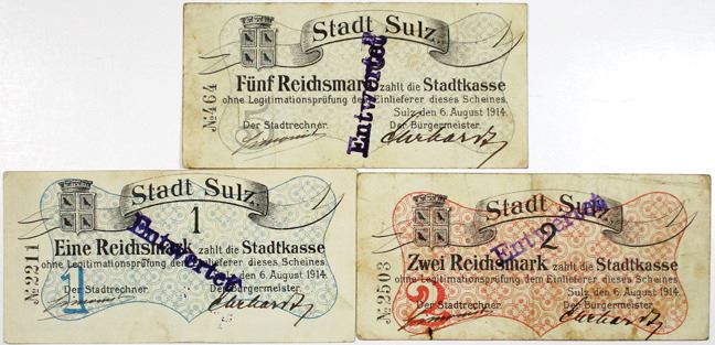 Germany and France. 1914. Stadt Sulz, K-388, Lot includes a trio of 1, 2, and 5 Mark Notgeld, all with validation signatures, and later devalued with "Entwertet" handstamp . Fine to VF. Handwritten signatures of the municipal cashier Simonis and the mayor Ehrhardt. On the reverse, traces of German municipal stamp. N ° 3029. Cancellation on the obverse by “Entwertet” stamp. DN11 388.1. Pirot 68-365. (3)