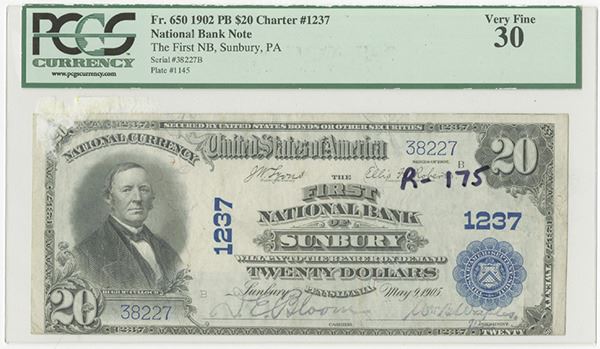 Sunbury, Pennsylvania. $20, Series 1902 PB,, Ch# 1237, Blue seal, S/N 38227, PCGS graded VF 30. Attractive note for grade with 3 large margins and just barely cut into the bottom margin. Only 6, $20 PB's are in the Track and Price census. BEP