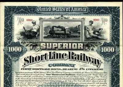 Wisconsin; Minnesota. 1895. $1,000. Specimen Consolidated 1st Mortgage Bond, Bearing 5% Interest. Slate Blue border. Speeding locomotive leaving station flanked by allegorical man and woman. Red specimen overprints, POC's and "00000" serial numbers. Coupons attached. XF condition. Unlisted railroad in Cox. Rare Wisconsin and Minnesota railroad. ABNC