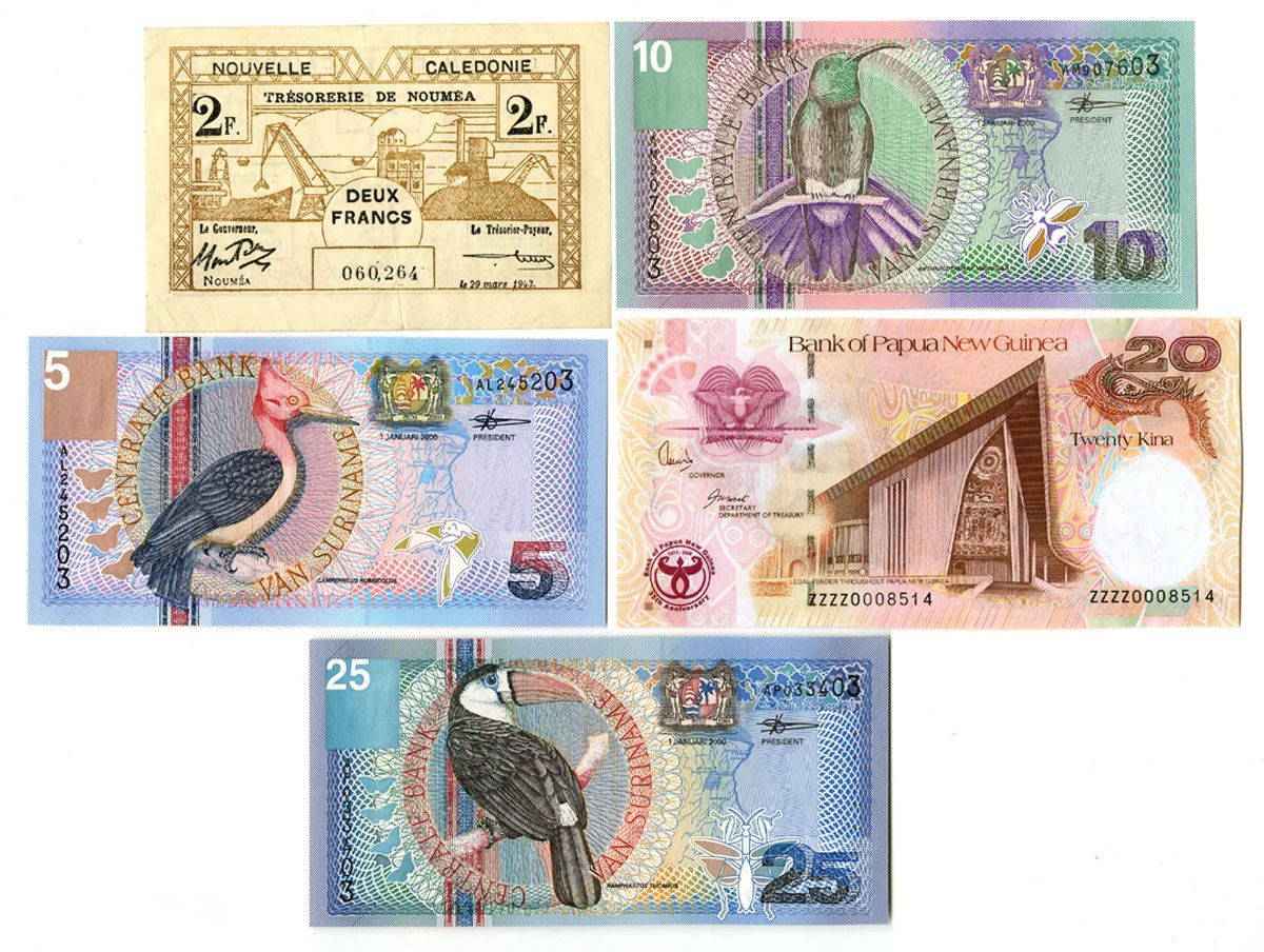 Surinam, New Caledonia, & PNG, 1943-2008. Lot of 5 Issued Banknotes, Includes: Tresorerie de Noumea - New Caledonia, 1943, 2 Francs, P-56a; Centrale Bank Van Suriname, 2000, 5 Gulden, P-146, TDLR; 2000, 10 Gulden, P-147, TDLR; 2000, 25 Gulden, P-148, TDLR; Bank of Papua New Guinea, 2008, 20 Kina, P-36a, Replacement Note. Notes range from Choice VF to UNC condition. (5). Sold "AS IS" no returns accepted.