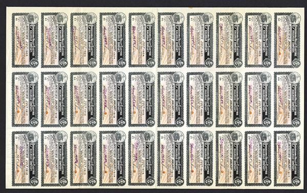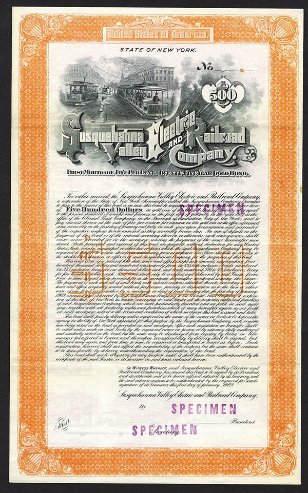 New York. 1902. Specimen bond. $500. 1st Mortgage 5%, 25 year Gold Bond. Ornate street car scene. POC's and purple Specimen overprints. Coupons attached. XF condition. Hamilton BNC. Rare bond. This is the only example found in the archives and is the pictured plate bond Cox's web site.
