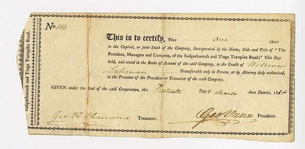 Early Pennsylvania Turnpike Stock Certificate, March 13, 1818, 1 share, I/U, Black with ornate border, S/N 114, VF.