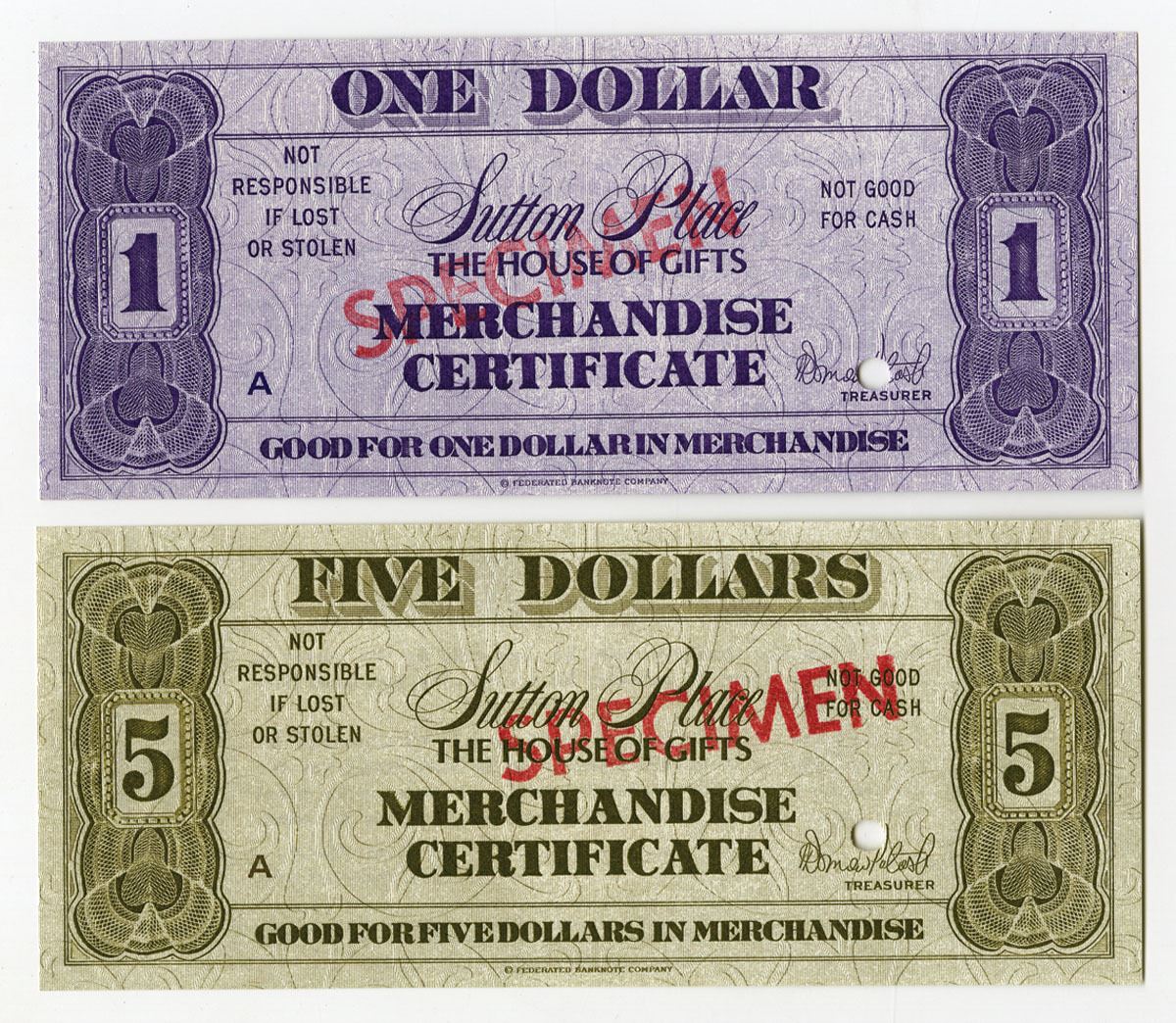 USA, ND (1970-80s). 1 Dollar and 5 Dollar Specimen Merchandise Certificates, Specimen overprints and POCs, AU to UNC condition. From the ABNC Archives. (2).