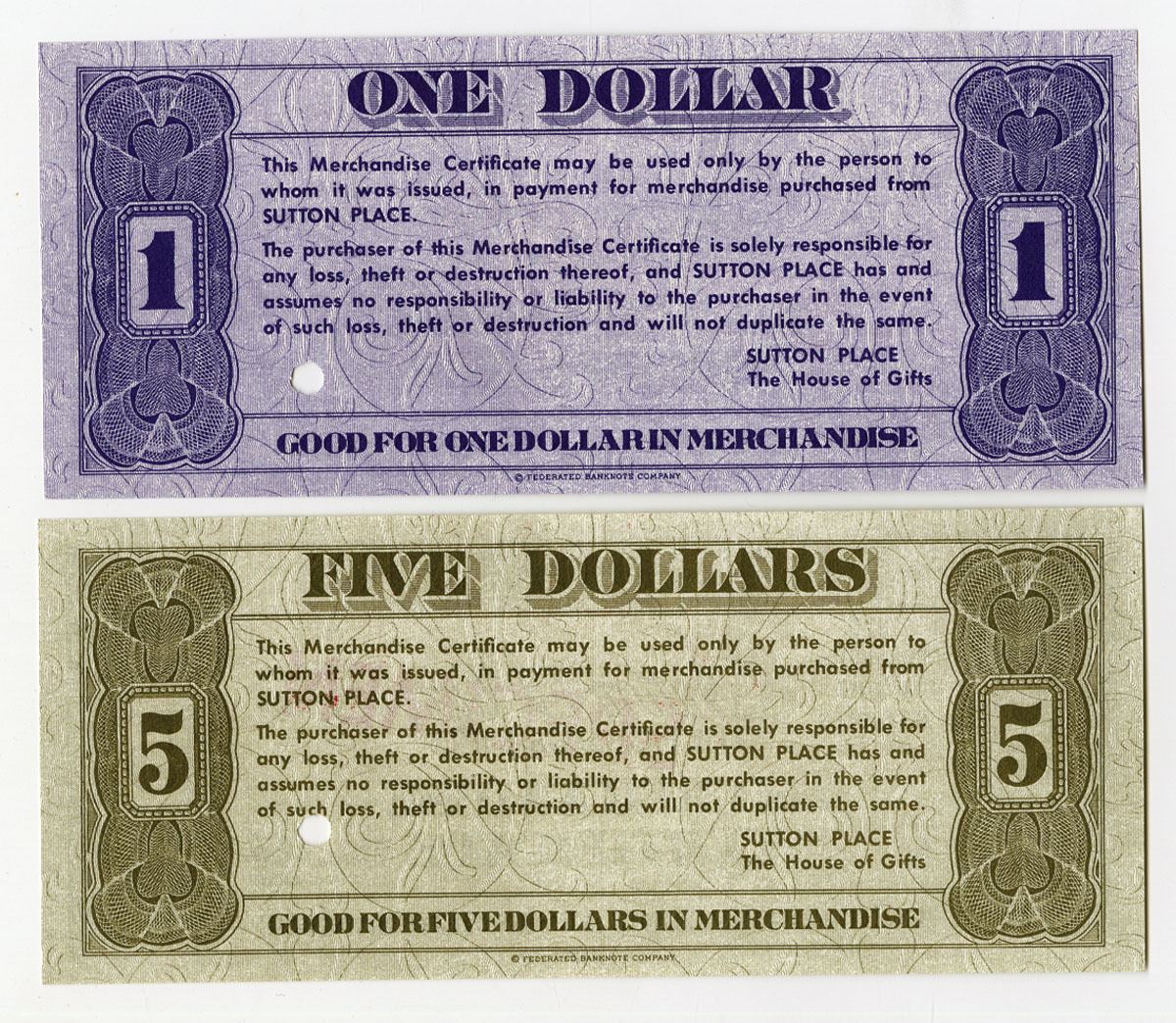 USA, ND (1970-80s). 1 Dollar and 5 Dollar Specimen Merchandise Certificates, Specimen overprints and POCs, AU to UNC condition. From the ABNC Archives. (2).