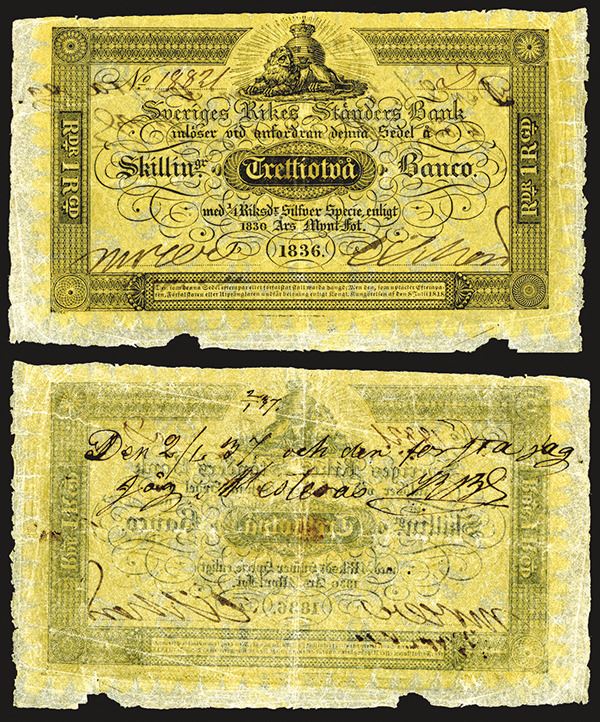 Issued banknote. 32 Skillingar Banco, A123a, hand written serial number, VF to Choice VF with small chips out of bottom excess margin, S/N 18821, Ink notations on back, high grade for this attractive issue.