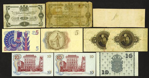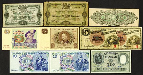 Sweden. 1 Riksdaler; 1, 5, 10 Kronor. P-A139b Very Good, rough edges; P-32a, 33 1948 (paper loss), 1952; 42a 1960; 43c 1955; 51 1965; 56 (2). Plus a 50 ore paid letter sheet (portion cut). One 56 and the 51 are Uncirculated. Others Fine to Very Fine except as noted. 10 pieces.