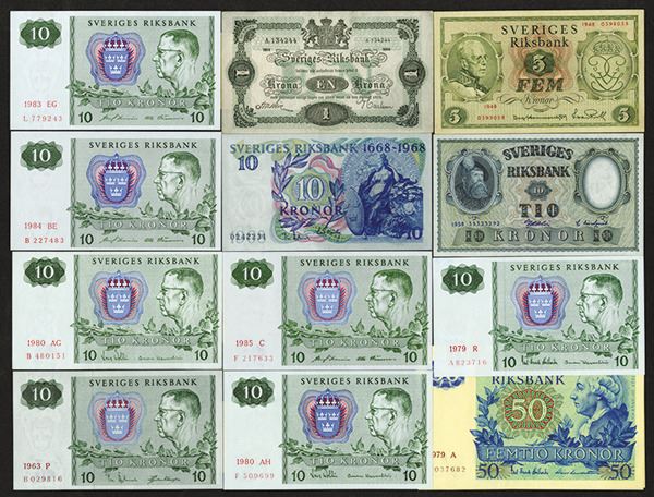 Sweden. 1, 5, 10, 50 Kronor. P-32a (EF); 41; 43f; 52a, d; e (5); 53c (2 one EF); 56a. Choice Uncirculated. 13 pieces.