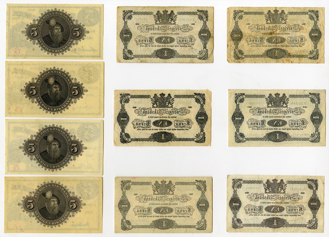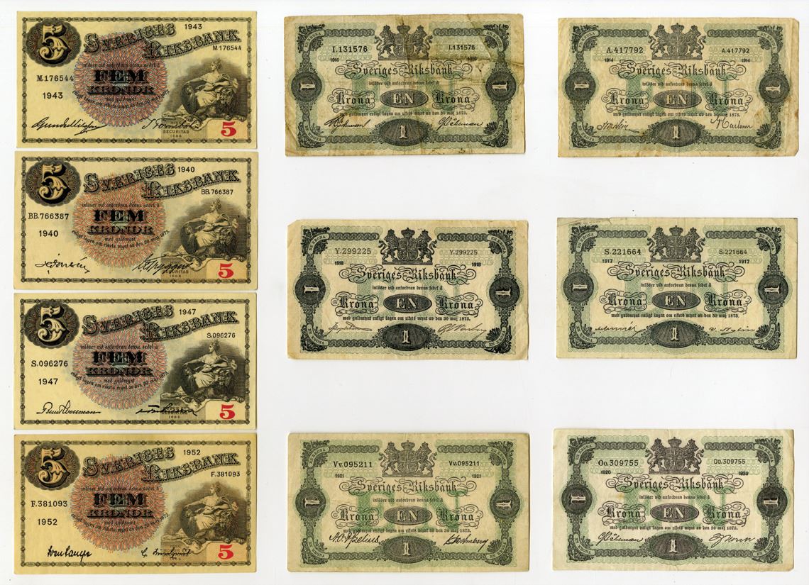 Sweden, 1914-52. Lot of 10 Issued Banknotes, Includes: 1 Korona, P-32a, P-32c, P-32d, P-32e, P32g,and P-32h, Black on green underprint with crowned and supported arms at center; 5 Kronor, P-33w, P33z, P-33ad; and P-33ai, Black on m/c underprint with Svea seated at right, Back is black with Gustav Vasa at center. Fine to XF condition. (10). Sold "AS IS" no returns accepted.