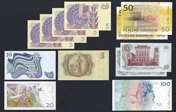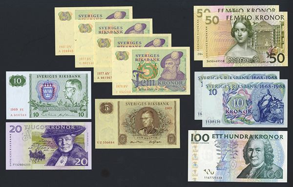 Sweden. 5, 10, 20, 50, 100 Kronor. SCWPM 50b 1963; c 1977; d 1977, 1978, 1981; 52e 1989; 56 1968 (2); 62a 2002; b 2003; 63a 1997; 65a. Many are first year or last year of the type/variety. All Very Choice Uncirculated or better. 12 pieces. (Arthur C. Matz Collection)