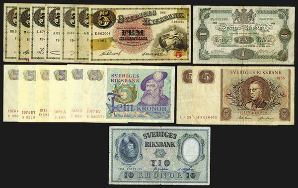 Sweden. Krona 1920; 5 Kronor 1940, 1942, 1943, 1945, 1947, 1948, 1951, 1955, 1956, 1973, 1974, 1976, 1977, 1978, 1979; 10 Kronor, 1958. Generally Very Good, some Fine. 17 pieces.