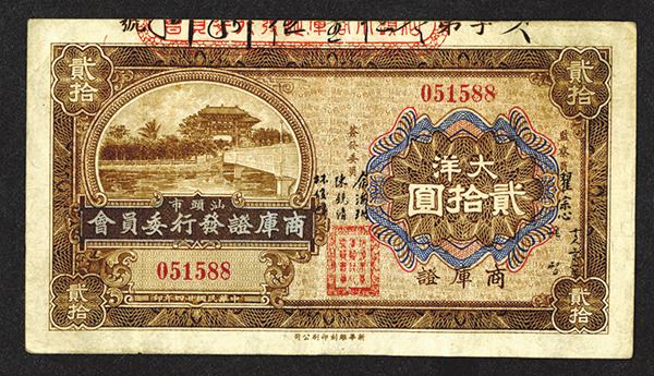 Swatow, $20, P-Unlisted, Issued banknote, Brown on m/c with bridge, river and building on left, back brown on red underprint with shrines on hillside by river, S/N 103908, Choice Fine to VF condition, Rare note that is seldom seen at auction. (The Silicon Valley Collection)