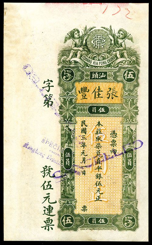 Swatow, China. ND (1900-30). $5, P-Unlisted, Specimen banknote, Red on turquoise-blue underprint, city scene on river with bridge and junks, vertical back olive-green on orange underprint with cherubs flanking company title, Specimen “Hongkong Printing Press.” overprints, light toning from previous mounting, otherwise it appears in Uncirculated condition, Extremely rare if not unique note. Hongkong Printing Press. First time seen by cataloger.