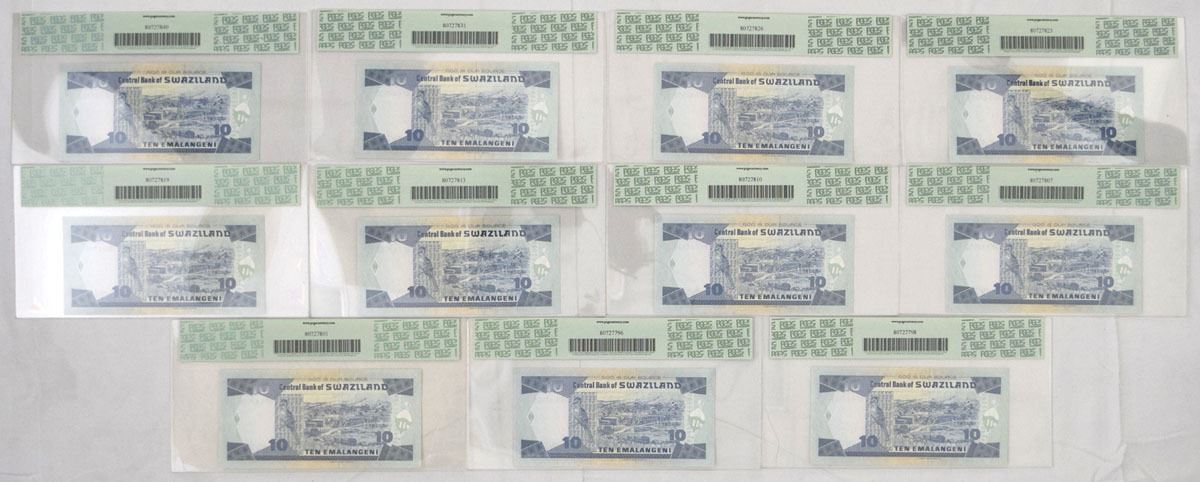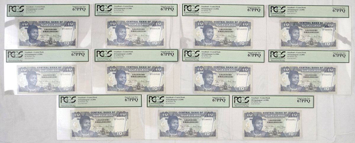 Swaziland, 2006. 10 Emalangeni, P-29c (11), Issued Banknote Assortment, Blue and m/c printing with portrait of King Mswati III at left, Back is blue on m/c with hydroelectric plant at center, S/Ns All start BF6448, All notes are PCGS graded Superb Gem New 67PPQ. (11). Sold "AS IS" no returns accepted.