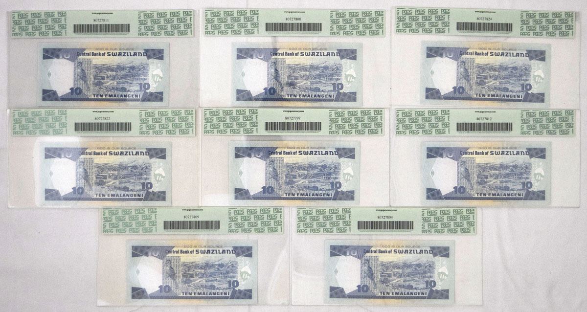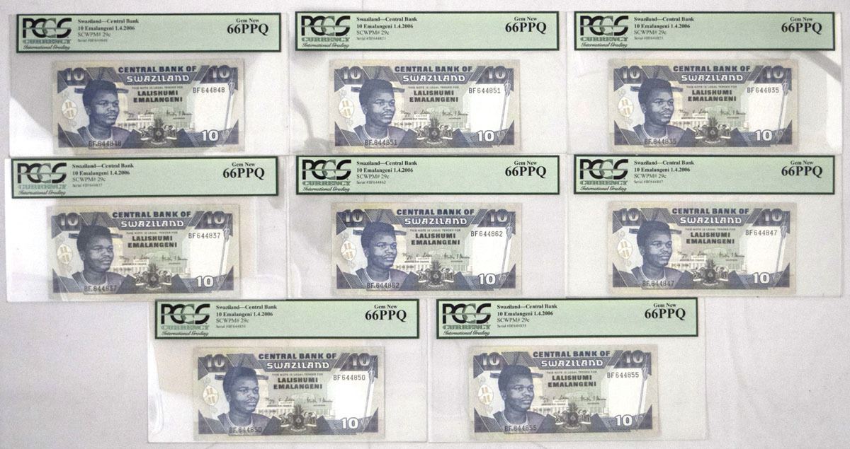 Swaziland, 2006. 10 Emalangeni, P-29c (8), Issued Banknote Assortment, Blue and m/c printing with portrait of King Mswati III at left, Back is blue on m/c with hydroelectric plant at center, S/Ns All start BF6448, All notes are PCGS graded Gem New 66PPQ. (8). Sold "AS IS" no returns accepted.