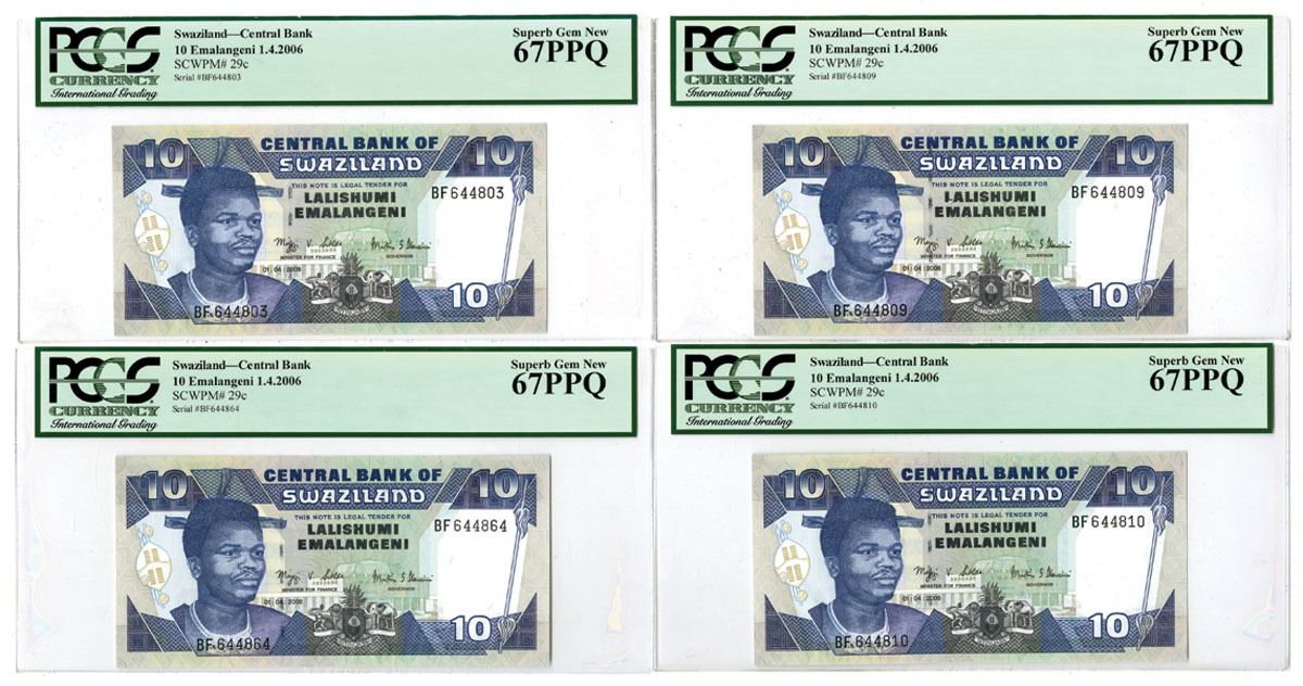 Swaziland, 2006. 10 Emalangeni, P-29c (4), Issued Banknote Quartet, Blue and m/c printing with portrait of King Mswati III at left, Back is blue on m/c with hydroelectric plant at center, All notes are PCGS graded Superb Gem New 67 PPQ. (4). Sold "AS IS" no returns accepted.