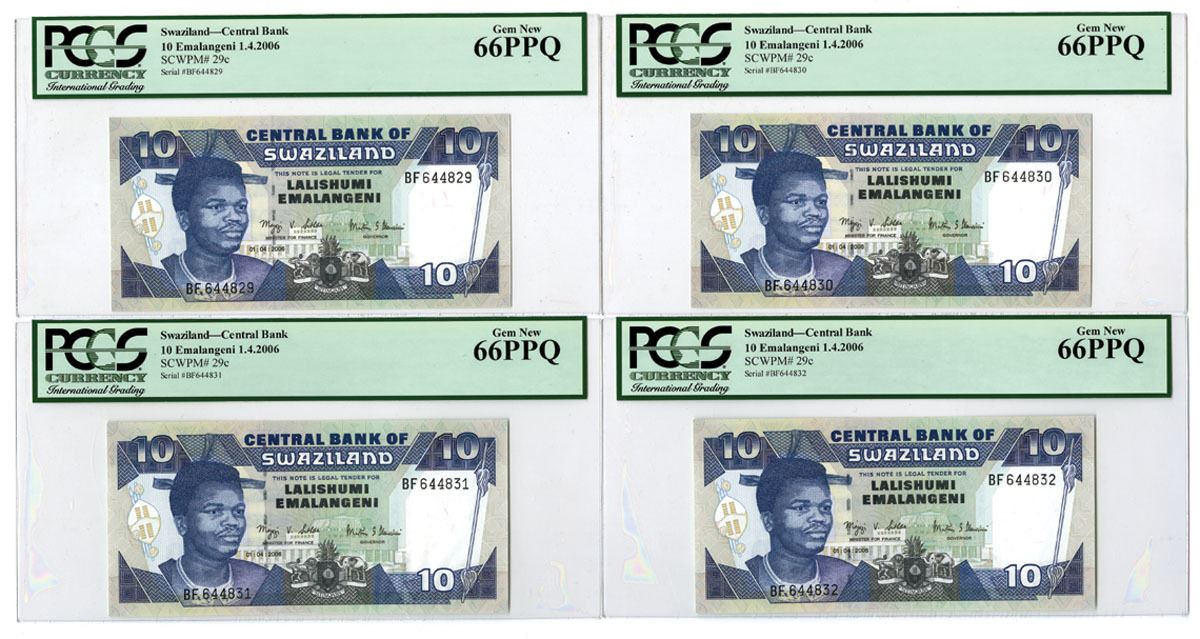 Swaziland, 2006. 10 Emalangeni, P-29c (4), Sequential Issued Quartet, Blue and m/c printing with portrait of King Mswati III at left, Back is blue on m/c with hydroelectric plant at center, S/Ns BF644829 to BF644832, Notes are all PCGS graded Gem New 66PPQ. (4). Sold "AS IS" no returns accepted.