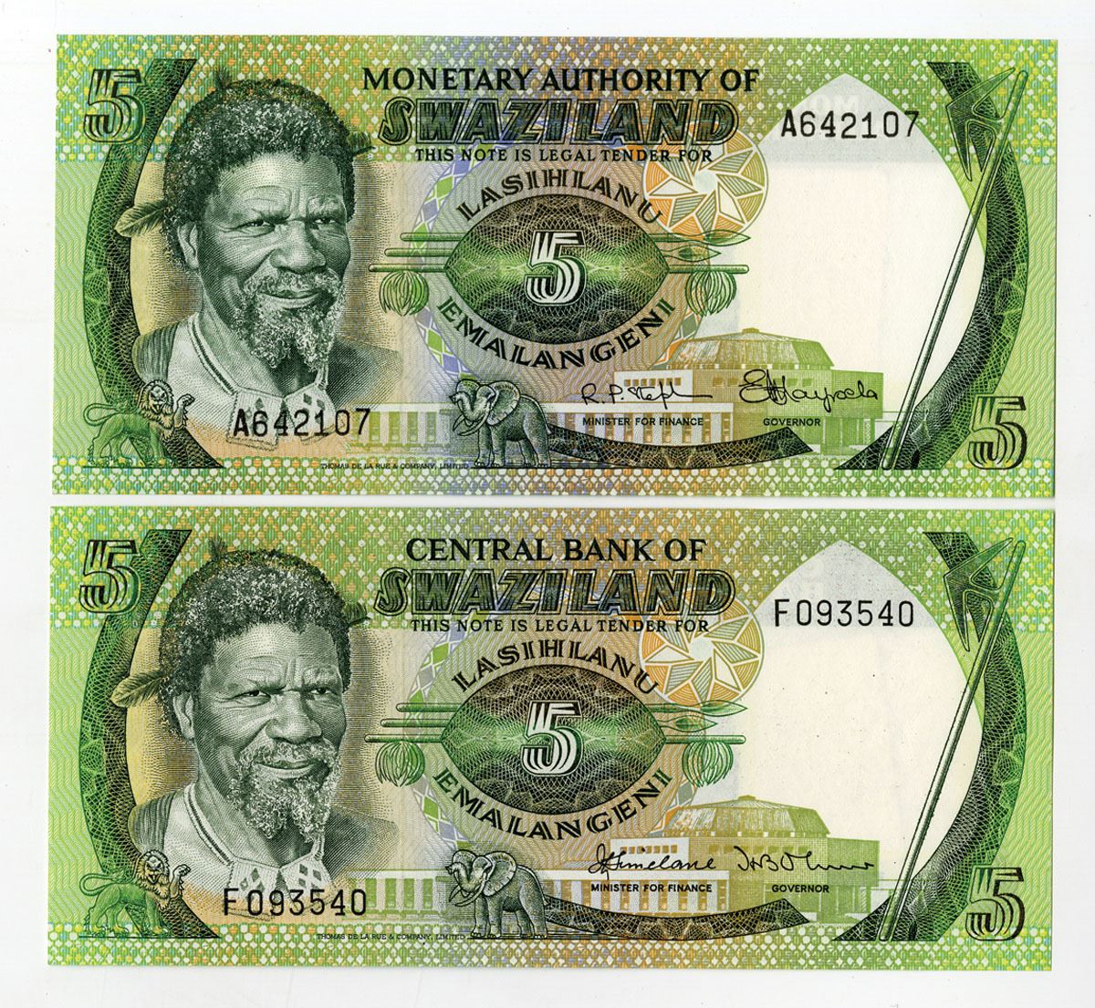 Swaziland, ND (1974)-ND (1982). Monetary Authority of Swaziland 5 Emalangeni, P-3a, ND (1974) and Central Bank of Swaziland 5 Emalangeni, P-9a, ND (19720. Notes are AU to UNC condition. (2).