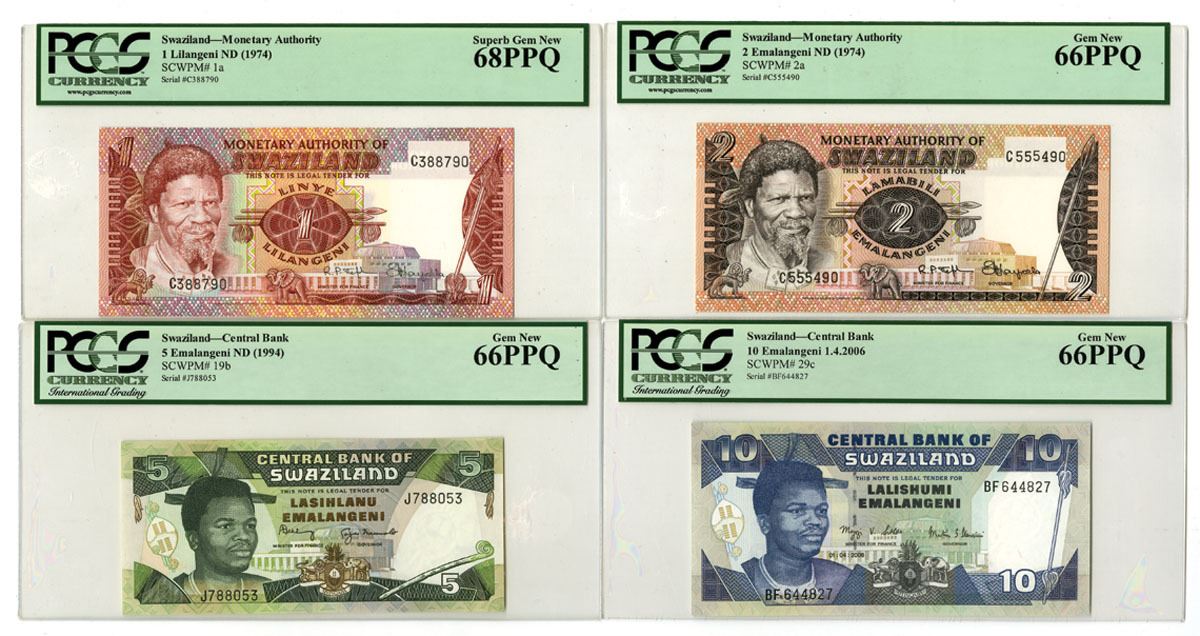 Swaziland, ND (1974)-2006. Lot of 4 Issued Banknotes, Includes: Monetary Authority of Swaziland, ND (1974), 1 lilangeni, P-1a, PCGS graded Superb Gem New 68 PPQ; ND (1974), 2 Emalangeni, P-2a, PCGS graded Gem New 66 PPQ; Central Bank of Swaziland, ND (1994), 5 Emalangeni, P-19b, PCGS graded Gem New 66 PPQ; 2006, 10 Emalangeni, P-29a, PCGS graded Gem New 66 PPQ. (4). Sold "AS IS" no returns accepted.