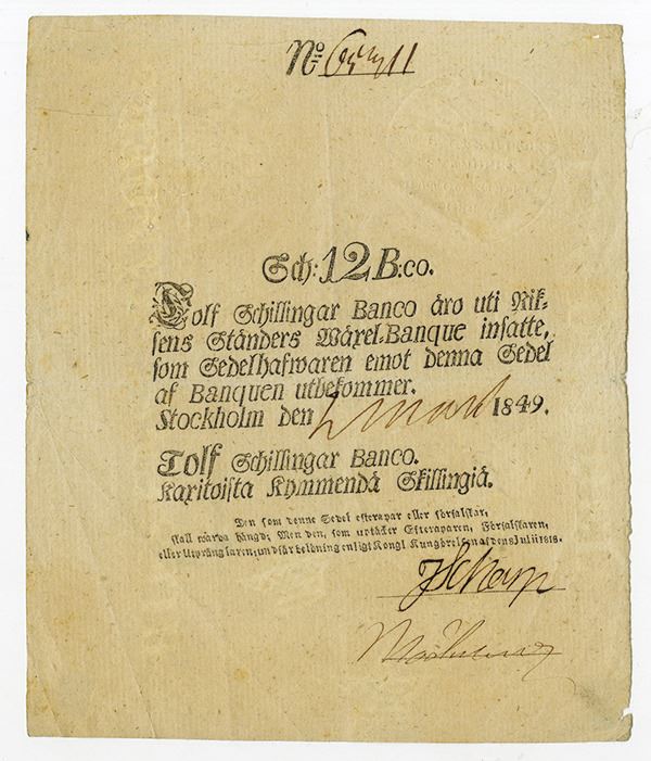 Sweden. Issued 12 Schillingar Banco, 1849, P-A101b, Fine to Very Fine with tape traces on reverse.