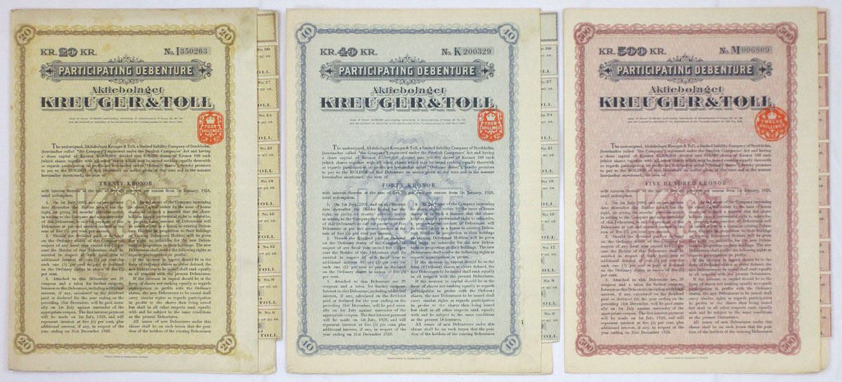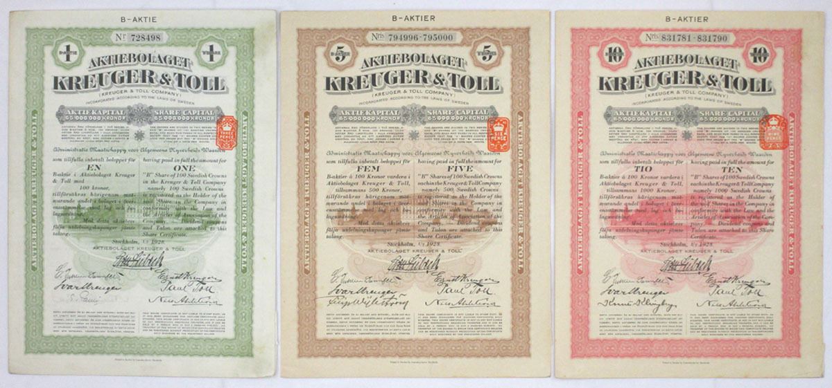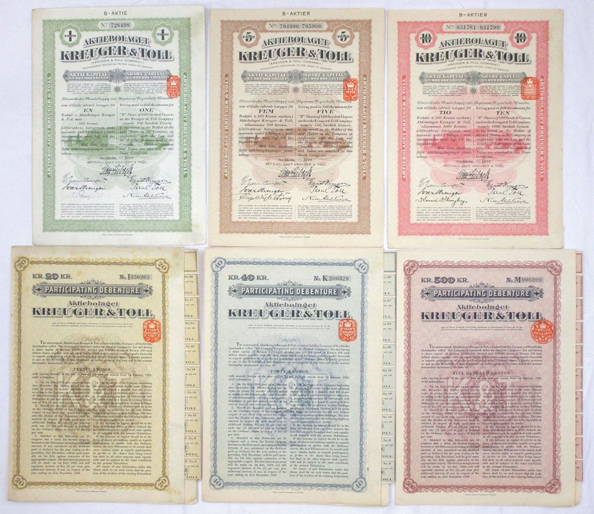 Sweden, 1928. Lot of 6 I/U stock certificates and debentures, including a mix of B-Aktie share certificates and Participating Debentures. Shares are represented in multiple denominations and border colors, while the debentures include varying krona values. Designs feature ornate engraved borders, company crests, and applied revenue stamps on select pieces. All are printed in Swedish and reflect the period corporate and financial style associated with the Kreuger & Toll group. Conditions range from VF to XF overall, with typical handling, light toning, and folds. (6). Sold “AS IS” no returns accepted.