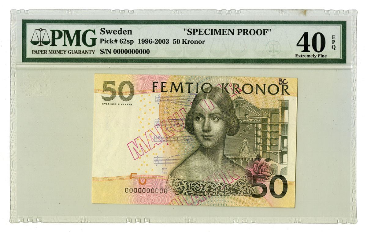 Sweden, ND (1996-2003). 50 Kronor, P-62sp, Specimen Proof Banknote, Deep olive brown on m/c underprint with Jenny Lind at center and music lines at left and stage at right, Back has violin with treble clef lines of notes and abstract sheet music, S/N 0000000000, PMG graded Extremely Fine 40 EPQ with comment "Printer's Annotation"