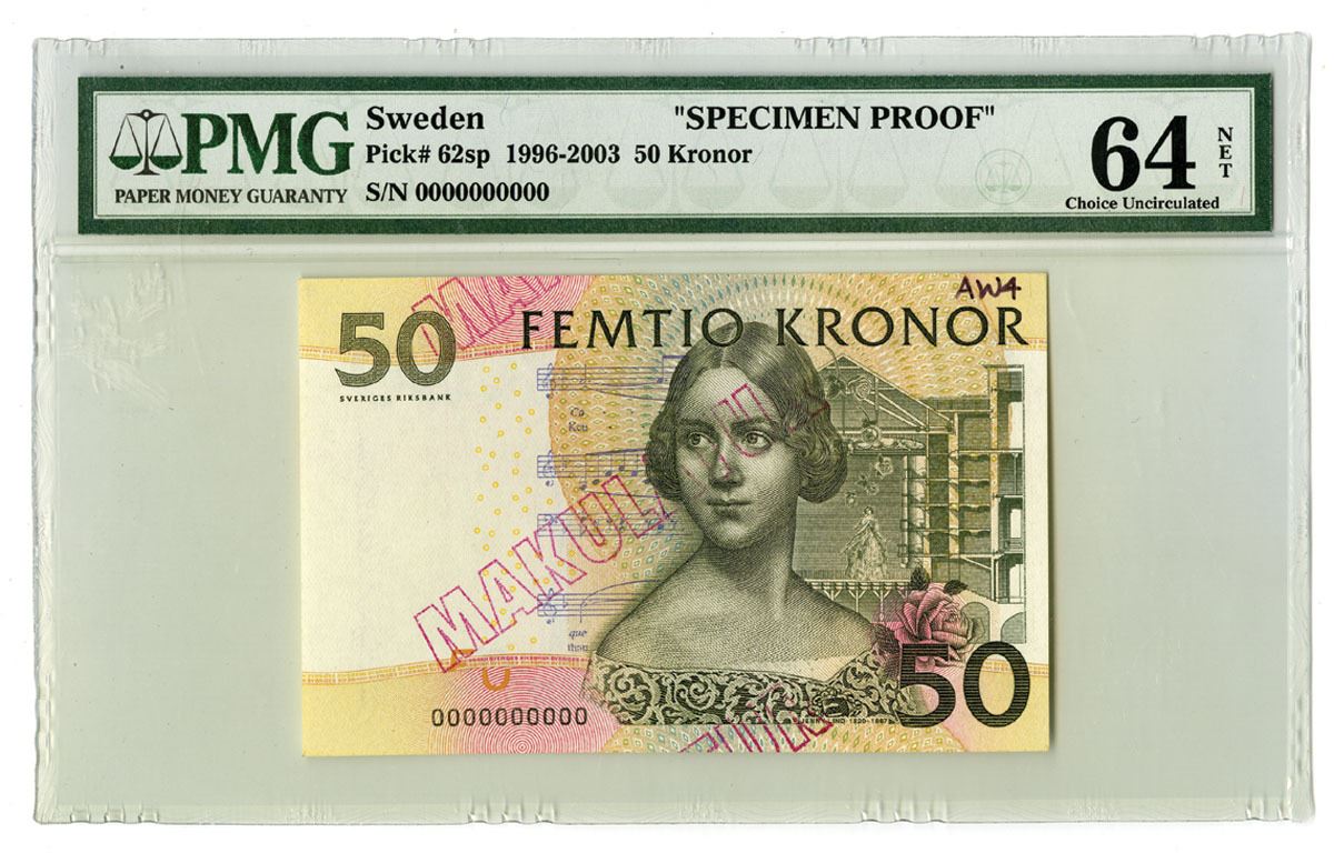 Sweden, ND (1996-2003). 50 Kronor, P-62sp Specimen Proof Banknote, Deep olive-brown on m/c underprint with Jenny Lind at center and music lines at left, Back is m/c with violin, treble clef with line of notes, and abstract musical design, S/N 0000000000, PMG graded Choice Uncirculated 64 NET with comments "Printer's Annotation and Previously Mounted"