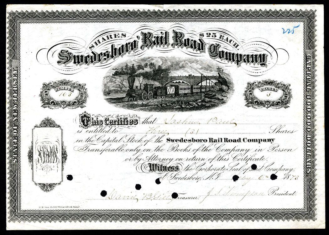 New Jersey, 3 Shares, I/C, locomotive under bridge. VF.